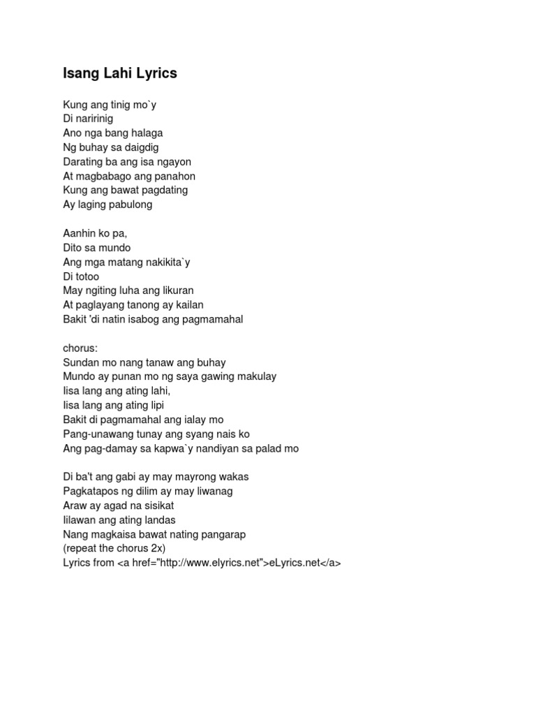 Mag-isa tayo mag-unlad tayo. Lyrics for Isang Lahi by Rodel Naval. Iisa lang ang ating lahi Iisa lang ang ating lipi Bakit di pagmamahal ang ialay mo Pang-unawang tunay ang syang nais ko Ang pag-damay sa kapway nandiyan sa palad mo Di bat ang gabi ay may mayrong wakas Pagkatapos ng dilim ay may liwanag Araw ay agad na sisikat Iilawan ang ating landas Nang magkaisa bawat nating pangarap.