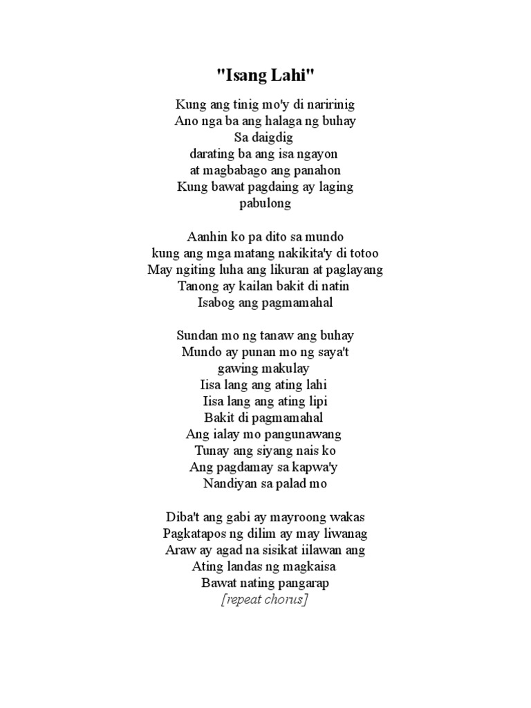 Iisa lang ang ating lahi. At magbabago ang panahon Kung bawat pagdaing ay laging pabulong Aanhin ko pa dito sa mundo Kung ang mga matang nakikitay di totoo May ngiting luha ang likuran at paglayang Tanong ay kailan bakit di. Mundo ay punan mo ng saya gawing makulay Iisa lang ang ating lahi Iisa lang ang ating lipi Bakit di pagmamahal ang ialay mo Pang-unawang tunay ang syang nais ko Ang pag-damay sa kapway nandiyan sa palad mo Di bat ang gabi ay may mayrong wakasu001d Pagkatapos ng dilim ay may liwanag Araw ay agad na sisikat Iilawan ang ating landas.